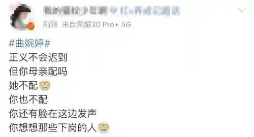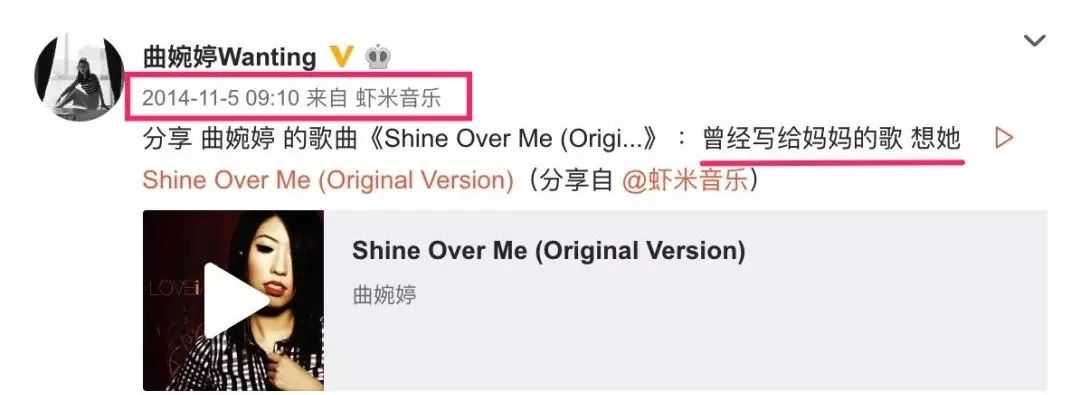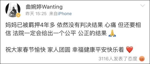 有人考古曲婉婷的微博发现,在她妈妈被带走的大半年里,曲只在2014年11月的时候发过一次想妈妈,但是后面配了自己的新歌宣传