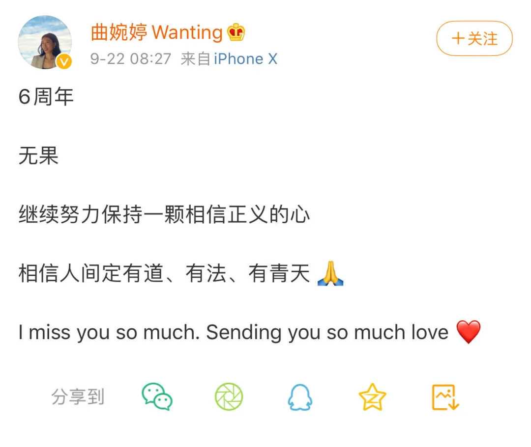 歌手曲婉婷的一条微博动态