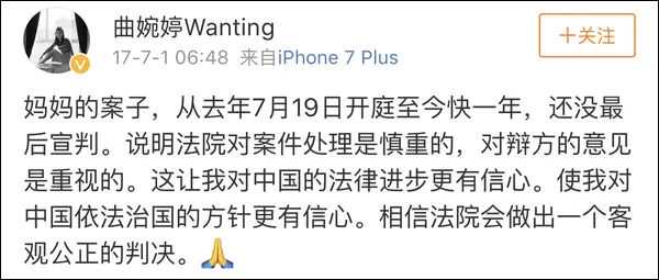 她在2017年3月的一条微博中还要求网民在法庭未给予审判结果之前不要落井下石,杜绝造谣。