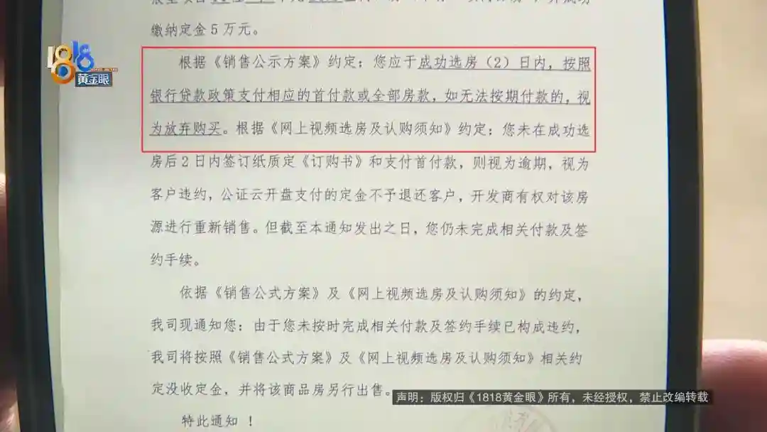 张女士:我们就收到了开发商给我们的挞定通知书。