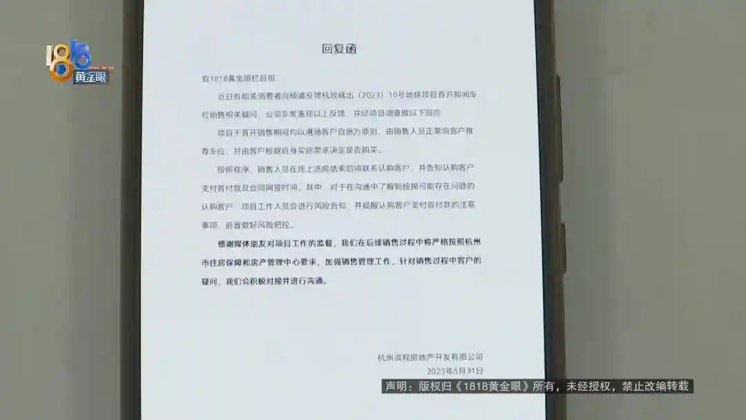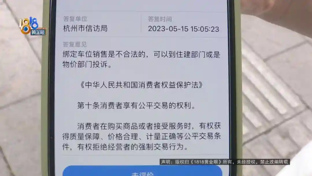 张女士介绍,当时有相同遭遇的还有另外五个人,大伙把情况反映给了有关部门。5月15号,杭州市信访局书面回复称:“绑定车位销售是不合法的,可以到住建部门或是物价部门投诉。”对方的依据是:按《消法》规定,消费者享有公平交易的权利,有权拒绝经营者的强制交易行为。