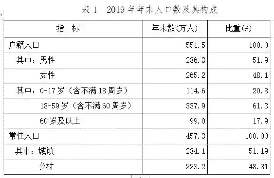 年末全市户籍总人口551.5万人,比上年末减少0.8万人;户籍人口城镇化率37.87%,比上年末提高2.28个百分点。年末常住人口457.3万人,比上年末增加1.7万人;常住人口城镇化率51.19%,比上年末提高1.55个百分点。全年出生人口5.23万人,出生率为9.24‰;死亡人口3.17万人,死亡率为5.60‰;人口自然增长率为3.64‰。