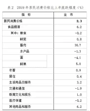 全年居民消费价格(CPI)比上年上涨2.3%。商品零售价格上涨2.2%。工业生产者出厂价格(PPI)上涨0.1%,其中生产资料价格下降1.9%,生活资料价格上涨3.0%;工业生产者购进价格(IPI)上涨0.1%。