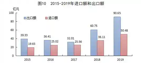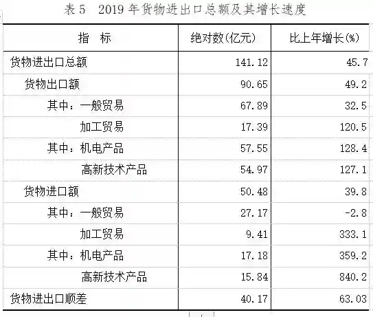 全年货物进出口总额141.12亿元,比上年增长45.7%。其中,出口90.65亿元,增长49.2%;进口50.48亿元,增长39.8%。货物进出口顺差40.17亿元,比上年增加15.53亿元。