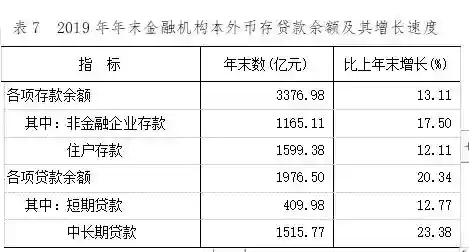 年末全部金融机构本外币各项存款余额3376.98亿元,比年初增加390.8亿元;其中人民币各项存款余额3366.8亿元,增加390.08亿元。全部金融机构本外币各项贷款余额1976.5亿元,增加325.58亿元;其中人民币各项贷款余额1971.69亿元,增加326.27亿元。