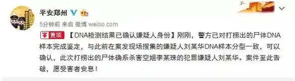郑州警方12日通报,“空姐打顺风车遇害”案告破,通过鉴定DNA样本,确认从河渠内打捞出的尸体确系杀害李某珠的犯罪嫌疑人刘某华。
