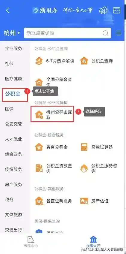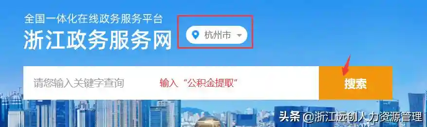 1、登录浙江政务网,选择杭州市,搜索关键词“公积金提取”