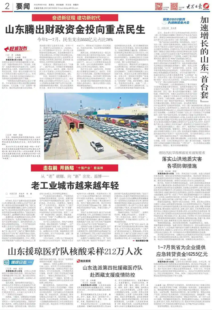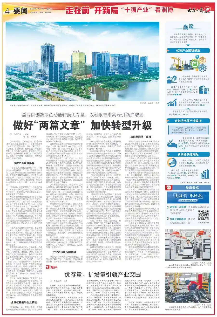身处转型跨越阵痛期和关键期的淄博,近年来“紧盯前沿、打造生态、沿链聚合、集群发展”,加力推动传统产业“弯道超车”,推动新兴产业“换道超车”,高质量发展全面起势,“走在前、开新局”步履铿锵。今年以来,淄博高效统筹疫情防控和经济社会发展,扎实推进“十大创新”“十强产业”“十大扩需求”行动,成效显著。